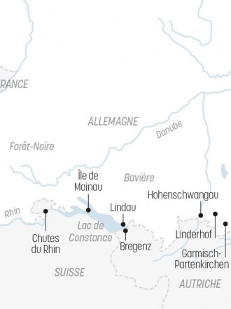 Depuis les rives romantiques du Lac de Constance aux légendaires châteaux royaux de Louis II de Bavière, Escapade vous propose cet agréable circuit qui vous fait découvrir les célèbres Chutes du Rhin puis les plus beaux attraits du Lac de Constance aux confins des frontières suisse, allemande et autrichienne. En Bavière, vous visitez les Châteaux royaux de Louis II de Bavière en même temps que vous goûtez à la beauté des Alpes.