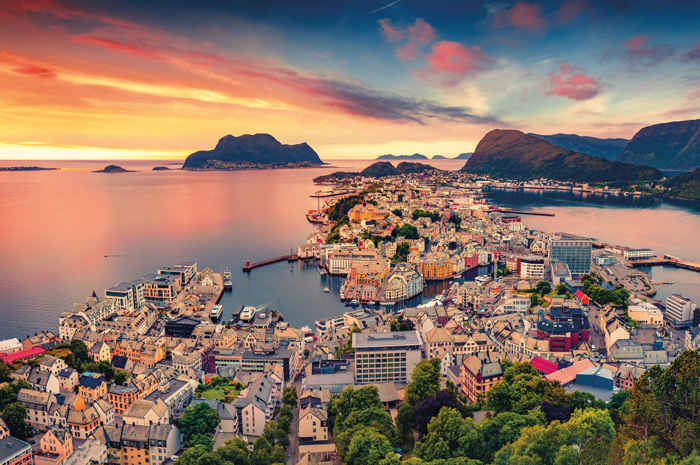 Itinéraire en direction de Geiranger. Déjeuner en cours de route. Après-midi, croisière exceptionnelle sur le Geirangerfjord jusqu’à Ålesund. Vous découvrez l’un des fjords les plus étroits et les plus impressionnants de Norvège, inscrit à l’inventaire de l’UNESCO. Arrivée à Ålesund, remarquable cité portuaire de style Art Nouveau. Dîner et logement en centre-ville.