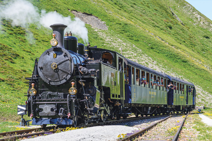 A Oberwald, embarquement à bord du train à crémaillère de la Furka. Mis en service par des passionnés du chemin de fer, le train tracté par une locomotive à vapeur relie Realp selon un itinéraire remarquable au col de la Furka : viaducs, prouesses techniques et tunnels étroits longeant le glacier du Rhône. Déjeuner au restaurant à Andermatt. Poursuite du voyage vers Bivio. Installation à l’hôtel, dîner et logement.